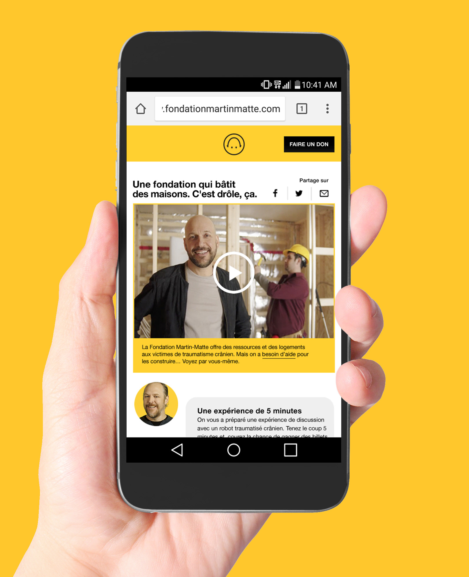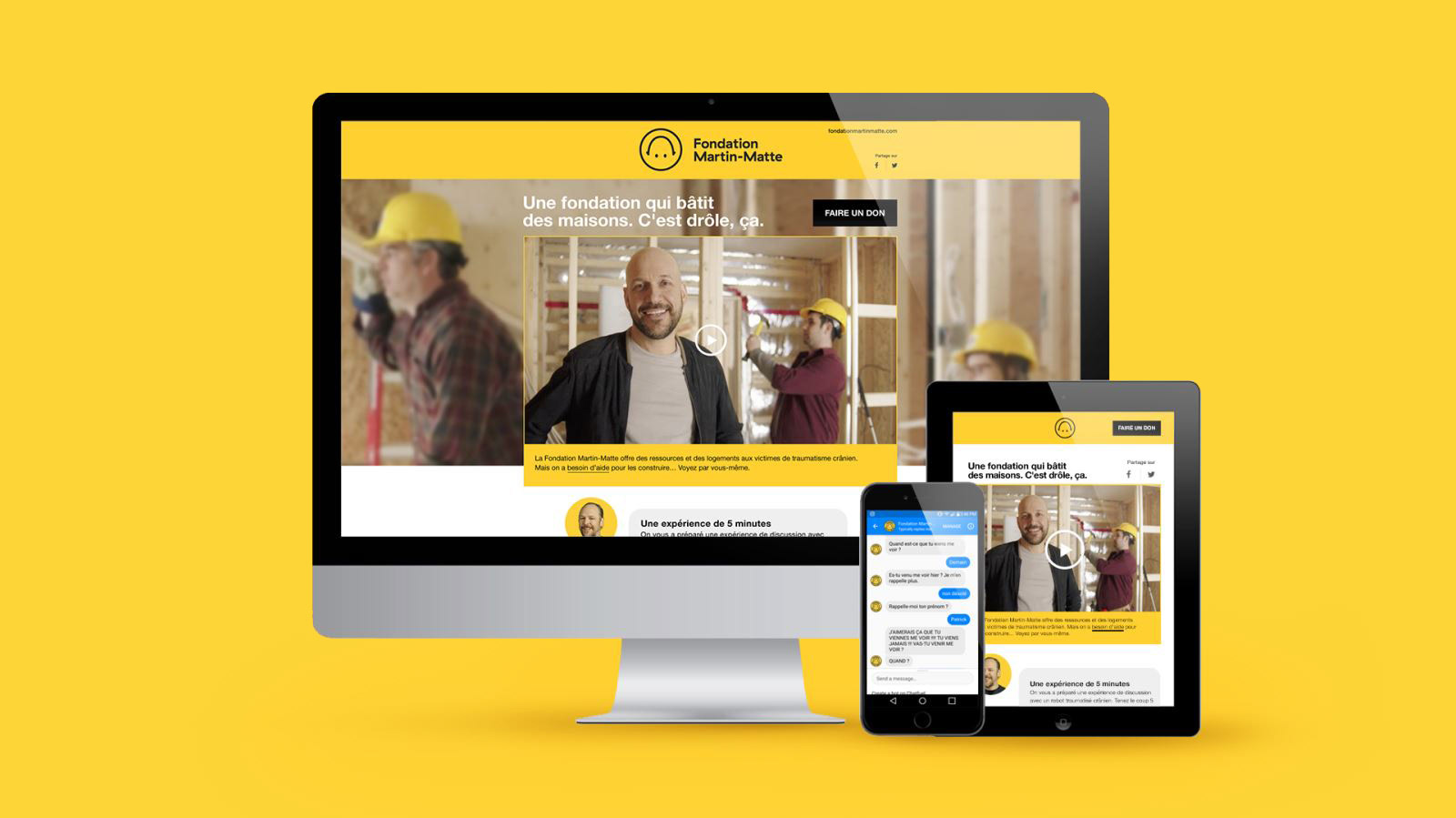 La Fondation Martin-Matte souligne ses 10 ans avec le lancement d'une campagne humoristique qui veut rappeler sa mission: offrir une meilleure qualité de vie et un chez-soi adapté aux enfants et aux adultes vivant avec un traumatisme crânien. Chaque année, 13 000 Québécois sont victimes de traumatismes crâniens. La campagne met en scène certains d'entre eux qui tentent d'aider à construire la nouvelle maison de la Fondation. /////////////// The Martin-Matte Foundation celebrates its 10th anniversary with the launch of a humorous campaign that aims to remind its mission: to offer a better quality of life and a home suitable for children and adults living with head trauma. Every year, 13,000 Quebecers are victims of head trauma. The campaign features some of them trying to help build the Foundation's new home.